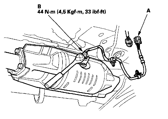 1. Disconnect the secondary HO2S 4P connector (A), then remove the secondary HO2S (B).