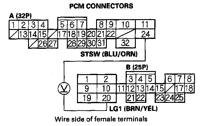 2. Measure voltage between PCM connector terminals A24 and B20 with the ignition switch in the START (Ill) position.