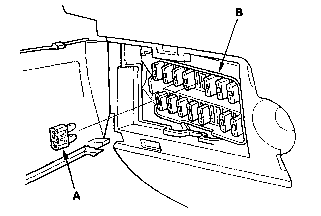 - Turn the ignition switch OFF, and remove the No.13 CLOCK BACKUP fuse (7.5 A) (A) from the passenger's under-dash fuse/relay box (B) for 10 seconds.
