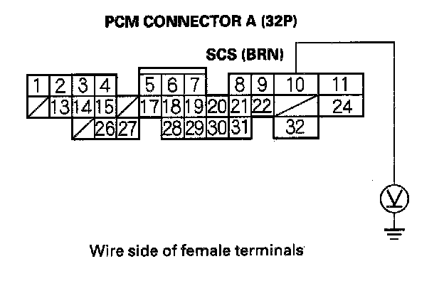 12. Measure voltage between PCM connector terminal A10 and body ground.