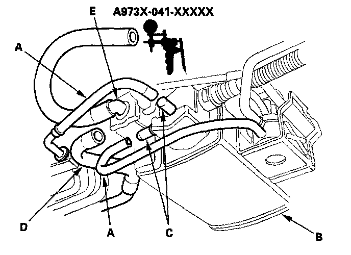 4. Disconnect the vacuum hoses (A) from the EVAP canister (B), then plug the ports with plugs (C).