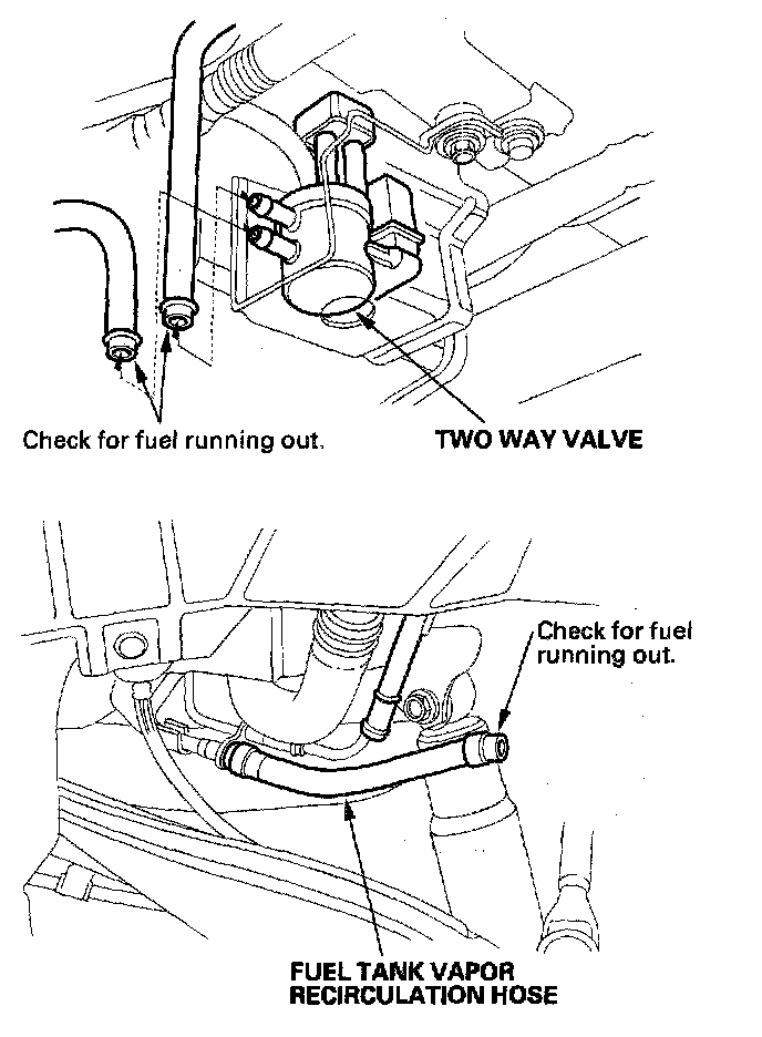 - If fuel runs out of the hoses at either location, replace the fuel tank vapor control valve.