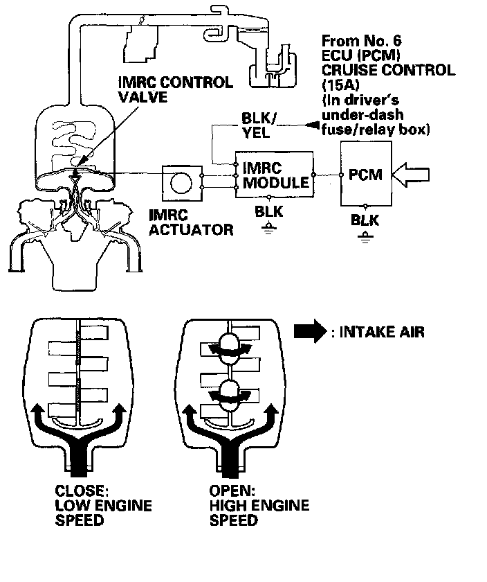Improved performance is achieved by closing and opening the intake manifold runner control (IMRC) control valves. High torque at low engine speed is achieved when the valves are closed, whereas high power at high engine speed is achieved when the valves are opened.