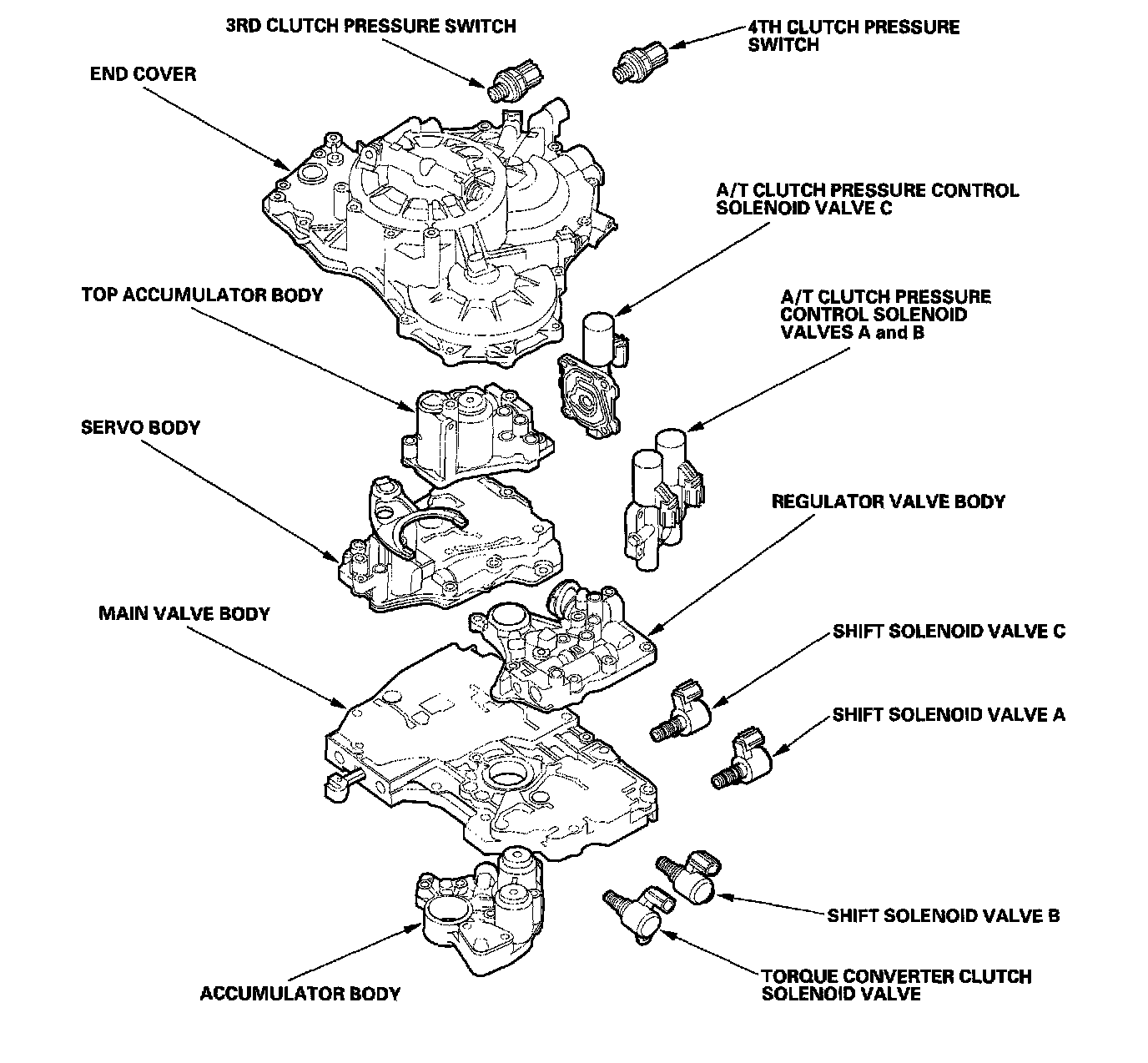 Hydraulic ControlsThe valve body includes the main valve body, the regulator valve body, the servo body, the top accumulator body, and the accumulator body. The ATF pump is driven by splines on the left end of the torque converter which is attached to the engine. Fluid flows through the regulator valve to maintain specified pressure through the main valve body to the manual valve, directing pressure to each of the clutches. The shift solenoid valves A and C are mounted on the outside of the torque converter housing. The shift solenoid valve B and the torque converter clutch solenoid valve are mounted on the torque converter housing. The A/T clutch pressure control solenoid valves A and B, and the A/T clutch pressure control solenoid valve C are mounted on the transmission housing.