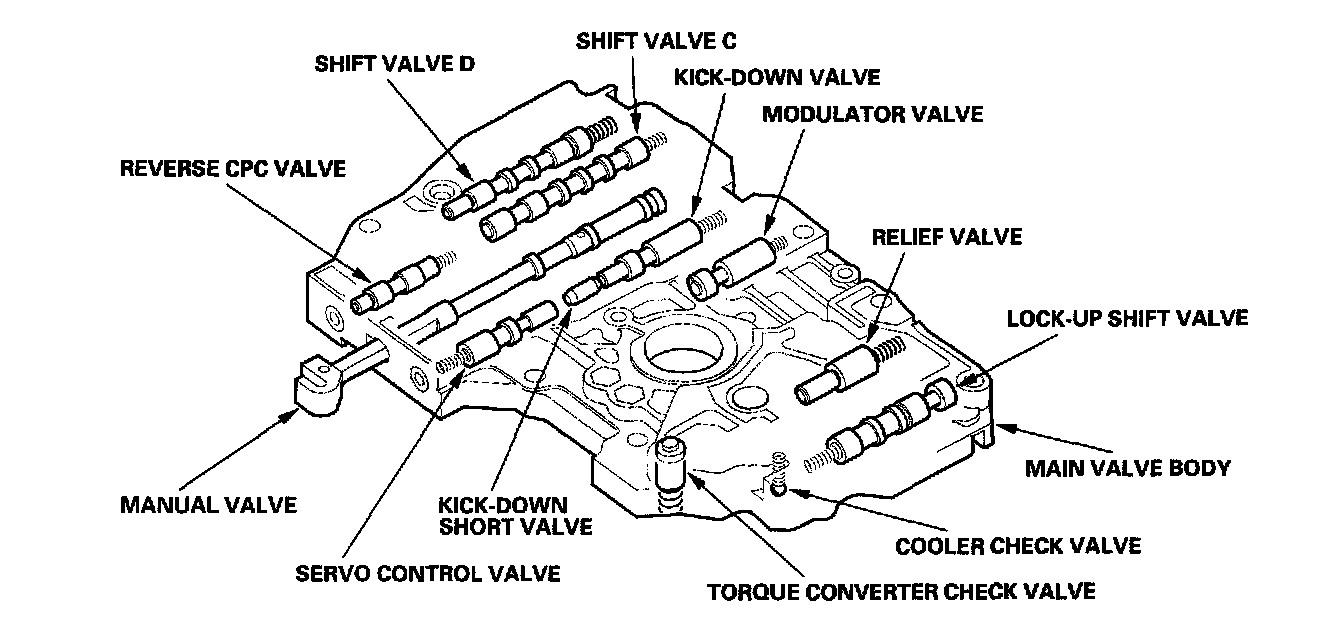 The main valve body contains the manual valve, the modulator valve, the shift valve C, the shift valve D, the servo control valve, the cooler check valve, the torque converter check valve, the reverse CPC valve, the lock-up shift valve, the relief valve, the kick-down valve, the kick-down short valve, and the ATF pump gears. The primary function of the main valve body is to switch fluid pressure on and off and to control hydraulic pressure going to the hydraulic control system.