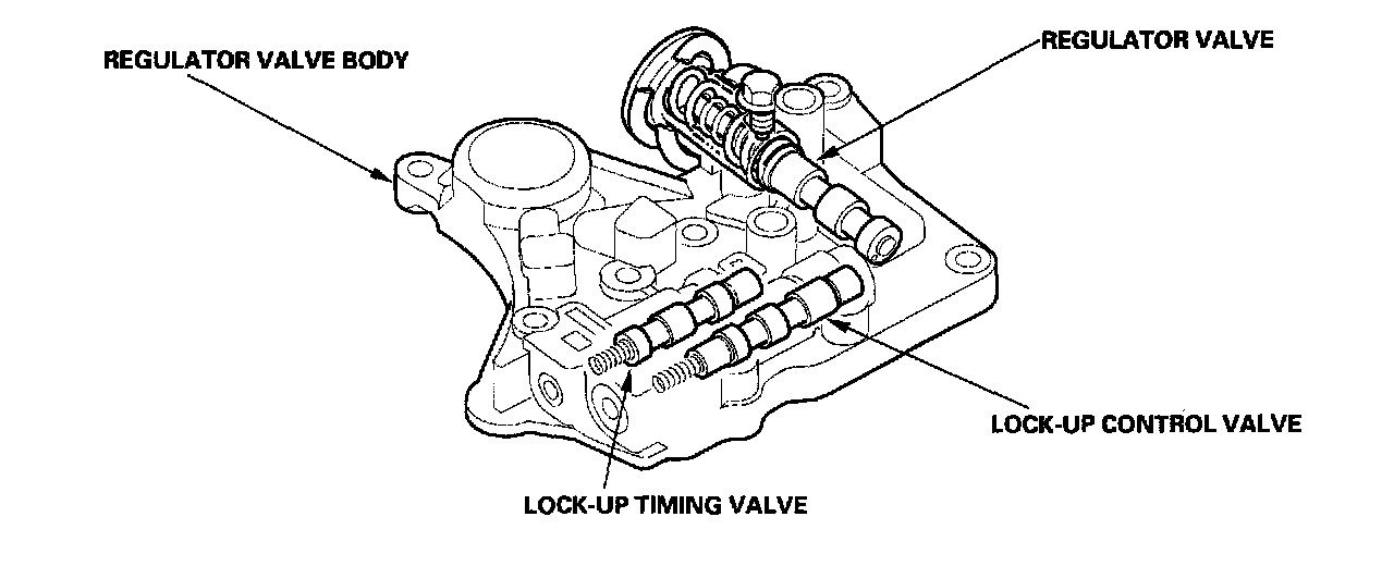 The regulator valve body is located on the main valve body. The regulator valve body contains the regulator valve, the lock-up timing valve, and the lock-up control valve.