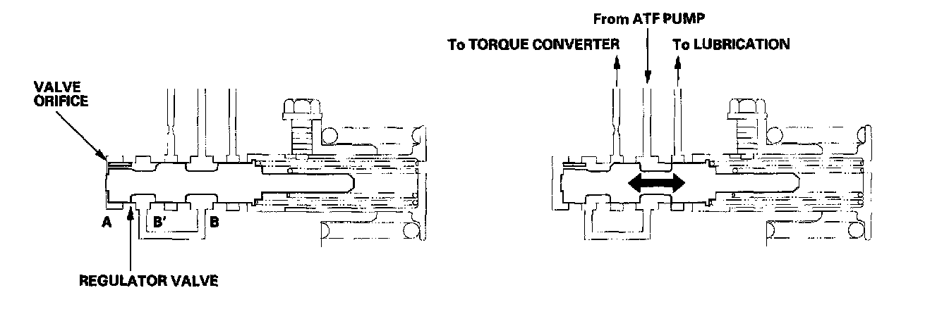 The regulator valve maintains constant hydraulic pressure from the ATF pump to the hydraulic control system, while also furnishing fluid to the lubricating system and torque converter. Fluid from the ATF pump flows through B and B'. Fluid entering from 8 flows through the valve orifice to the A cavity. This pressure of the A cavity pushes the regulator valve to the right side, and this movement of the regulator valve uncovers the fluid port to the torque converter and the relief valve. The fluid flows out to the torque converter and the relief valve, and the regulator valve moves to the left side. According to the level of the hydraulic pressure through B, the position of the regulator valve changes, and the amount of fluid from B' through the torque converter changes. This operation is continued, maintaining the line pressure.