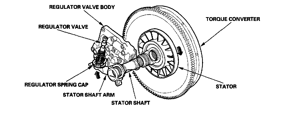 Increases in hydraulic pressure according to torque are performed by the regulator valve using stator torque reaction. The stator shaft is splined to the stator in the torque converter, and its arm end contacts the regulator spring cap. When the vehicle is accelerating or climbing (torque converter range), stator torque reaction acts on the stator shaft, and the stator arm pushes the regulator spring cap in the direction of the arrow in proportion to the reaction. The stator reaction spring compresses, and the regulator valve moves to increase the line pressure which is regulated by the regulator valve. The line pressure reaches its maximum when the stator torque reaction reaches its maximum.