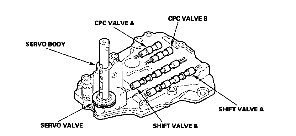 The servo body is on the main valve body. It contains the servo valve, shift valve A, shift valve B, and CPC valves A and B.