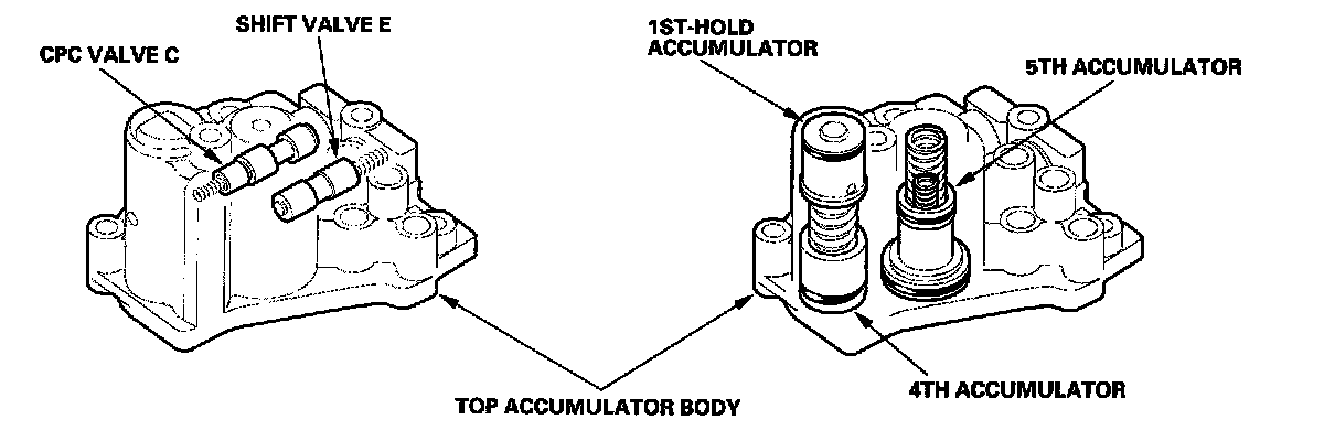 The top accumulator body contains shift valve E, CPC valve C, 4th/1st-hold accumulator, and 5th accumulator.