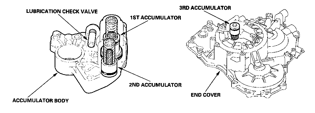 The accumulator body is on the torque converter housing, next to the main valve body. It contains the 1st and 2nd accumulators and the lubrication check valve.