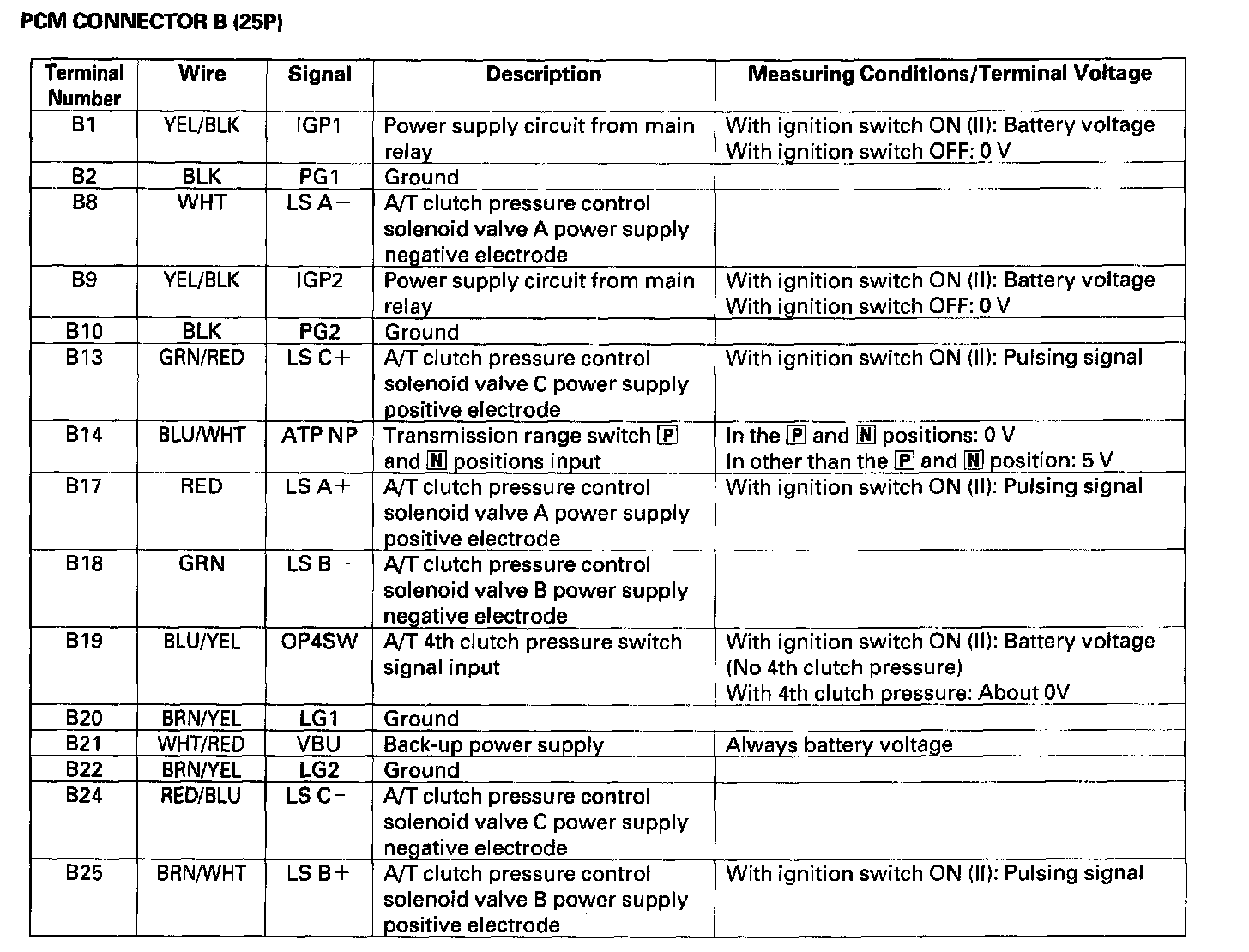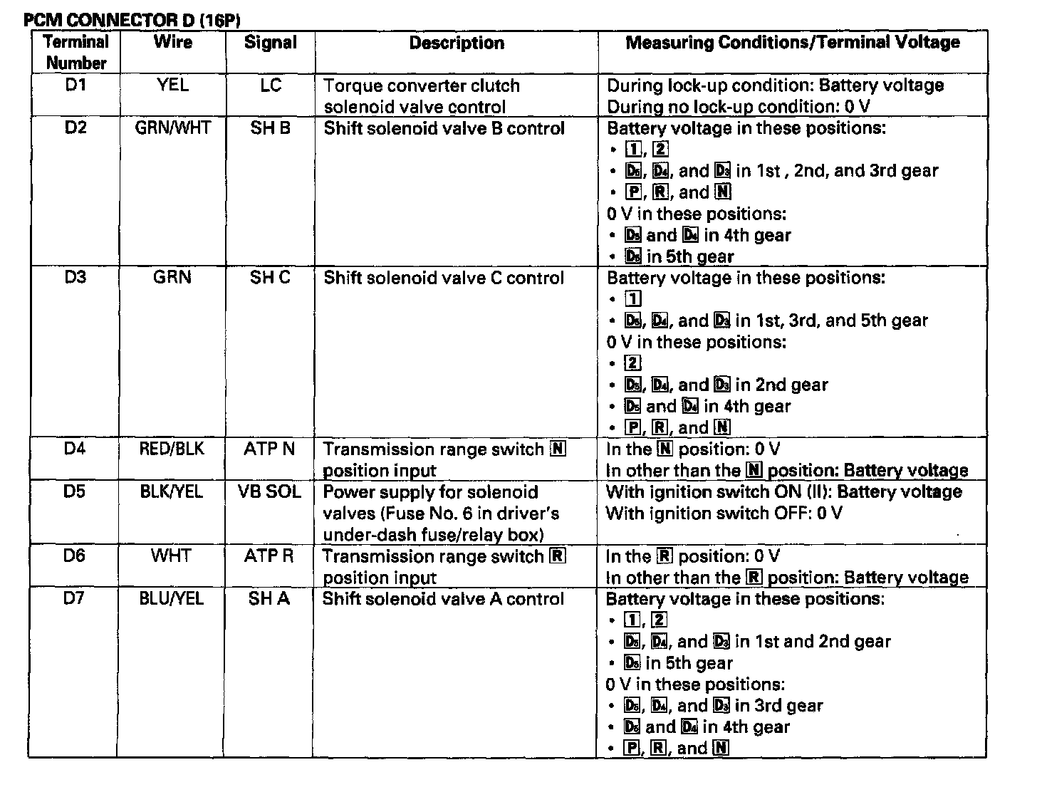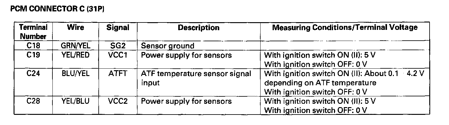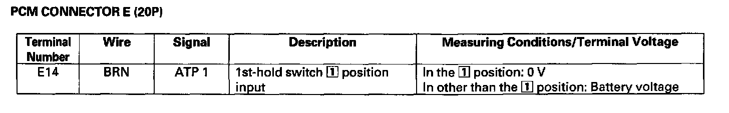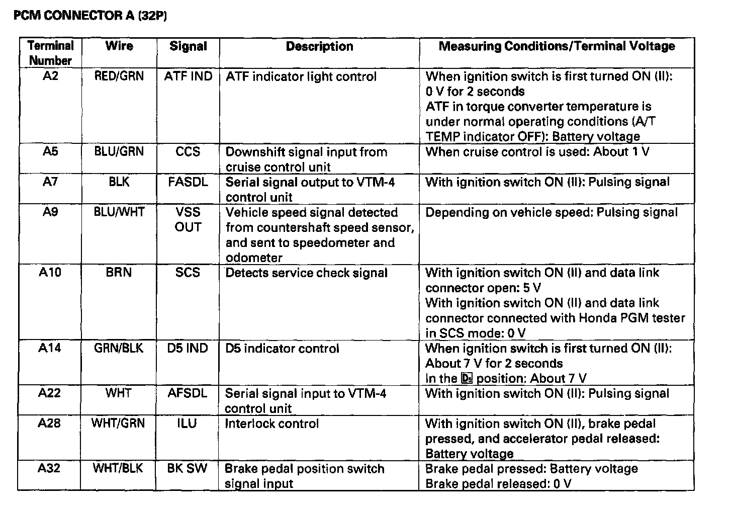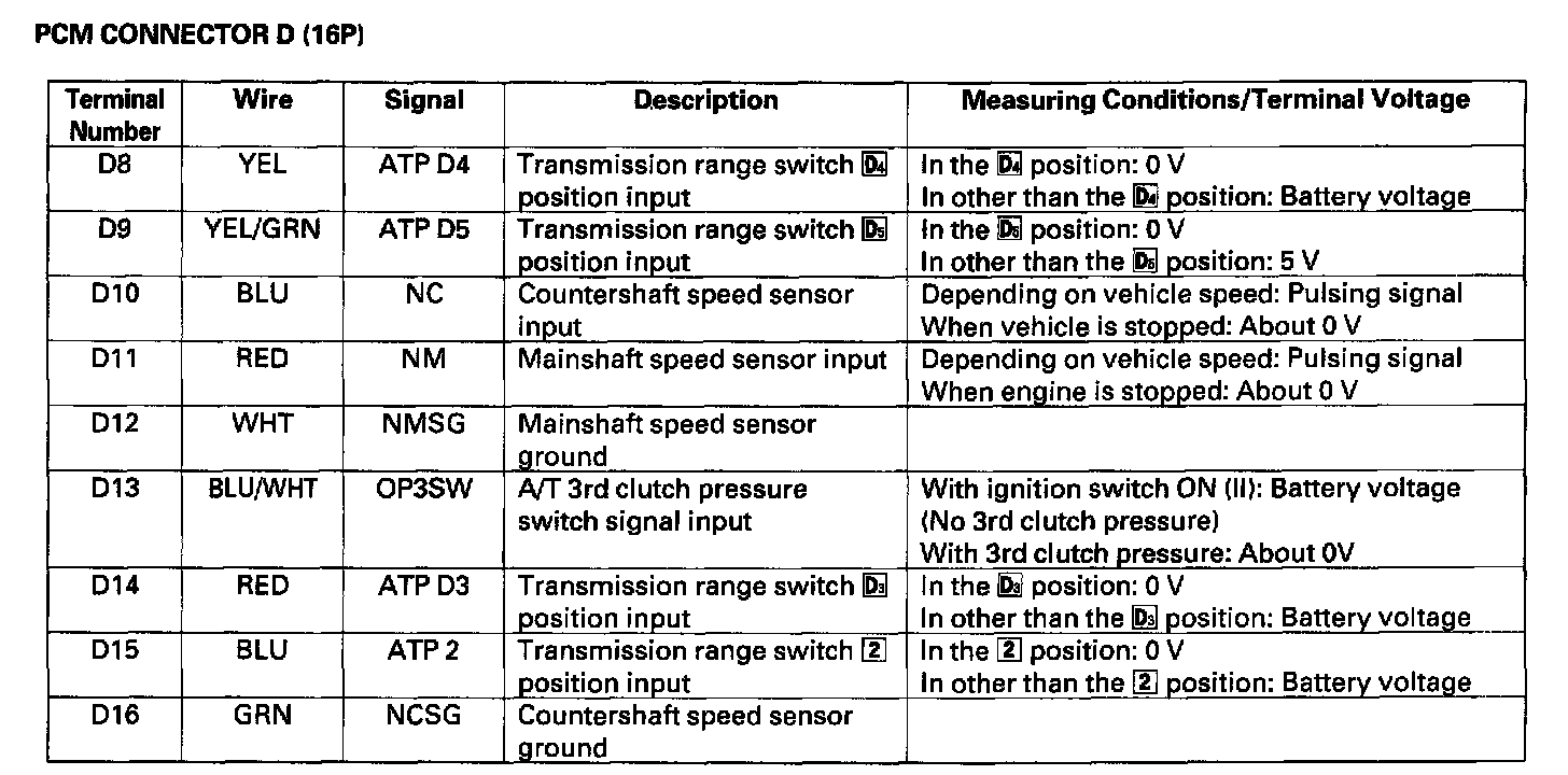 The PCM terminal voltage and measuring conditions for the A/T control system are shown.