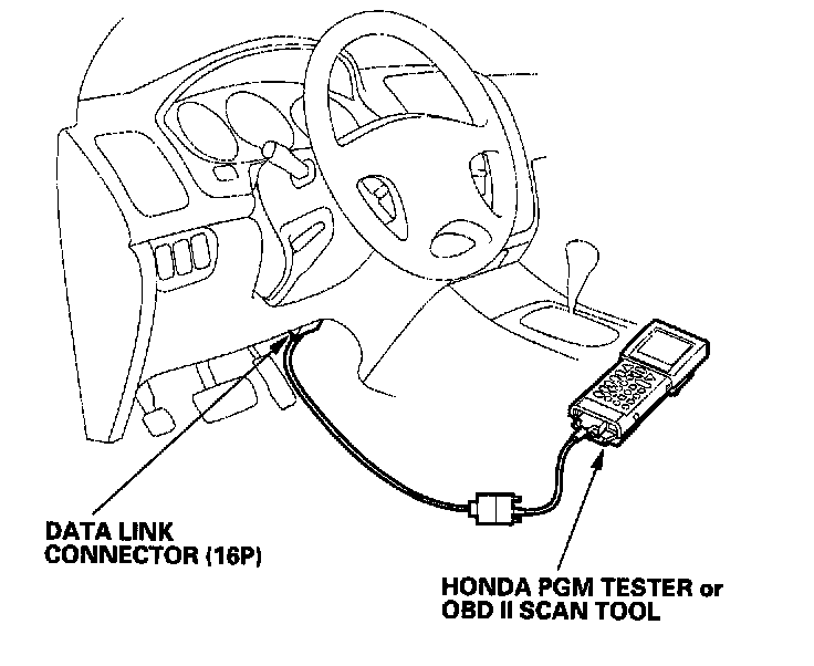 1. Connect the OBD II Scan Tool (conforming to SAE J1978) or Honda PGM Tester to the 16P DLC. (See the OBD II Scan Tool or Honda PGM Tester user's manual for specific instructions. If you are using the Honda PGM Tester, make sure it is set to the SAE DTC type.)