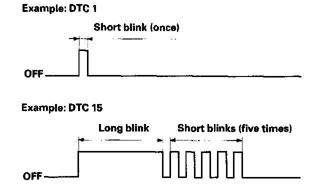 Codes 1 through 9 are indicated by individual short blinks. Code 10 and above are indicated by a series of long and short blinks. One long blink equals 10 short blinks. Add the long and short blinks together to determine the code. After determining the code, refer to the DTC Troubleshooting Index.