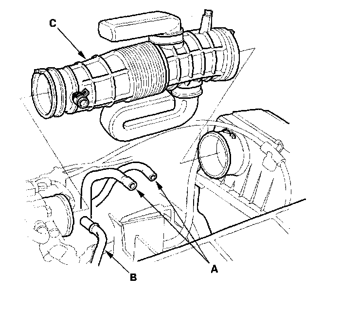 2. Remove the vacuum hoses (A) and breather pipe (B), then remove the intake air duct (C).