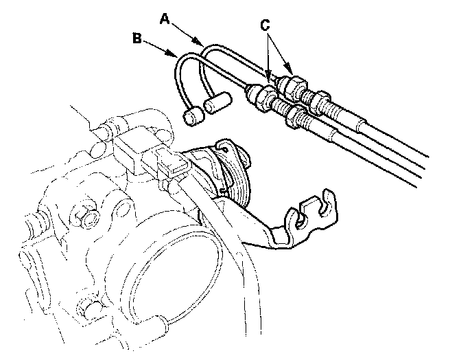 3. Remove the throttle cable (A) and cruise control cable (B) by loosening the locknuts (C), then slipping the cable ends out of the accelerator linkage. Take care not to bend the cables when removing them. Always replace any kinked cable with a new one.