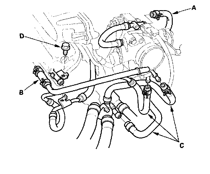 4. Remove the Evaporative Emission (EVAP) canister hose (A), breather hose (B), water bypass hoses (C), and water bypass pipe mounting bolt (D).
