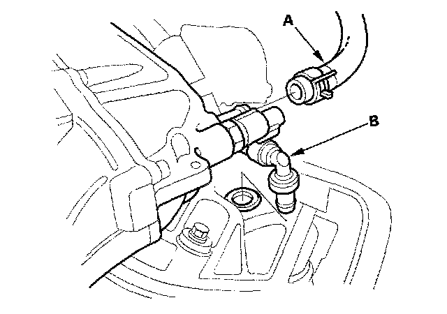 5. Remove the brake booster vacuum hose (A) and Positive Crankcase Ventilation (PCV) hose (B).