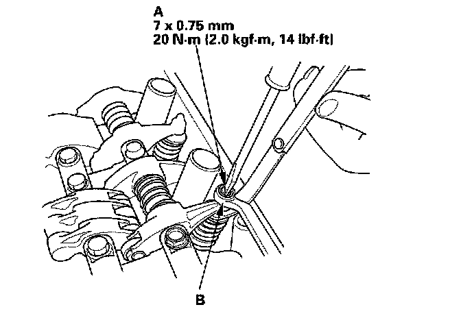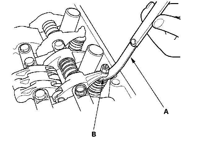 14. Insert the feeler gauge (A) between the adjusting screw (B) and the end of the valve stem and slide it back and forth; you should feel a slight amount of drag.