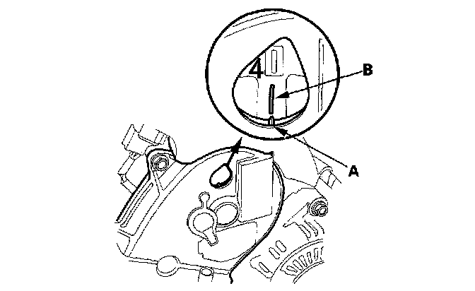 17. Rotate the crankshaft clockwise. Align the pointer (A) on the front upper cover with the No. 4 piston TDC mark (B) on the front camshaft pulley.