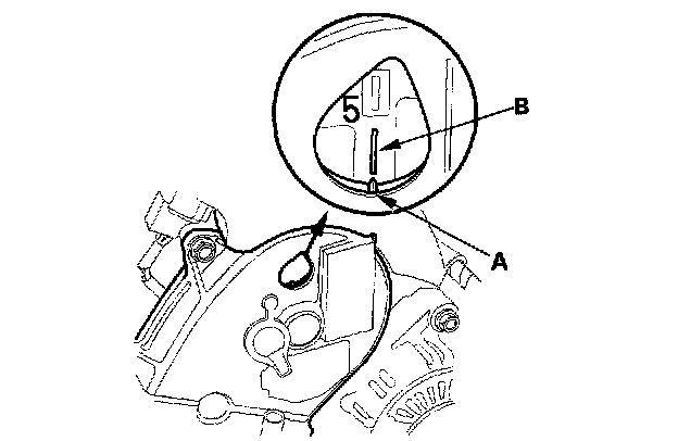21. Rotate the crankshaft clockwise. Align the pointer (A) on the front upper cover with the No. 5 piston TDC mark (B) on the front camshaft pulley.