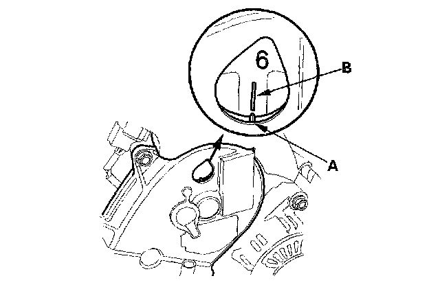 25. Rotate the crankshaft clockwise. Align the pointer (A) on the front upper cover with the No. 6 piston TDC mark (B) on the front camshaft pulley.