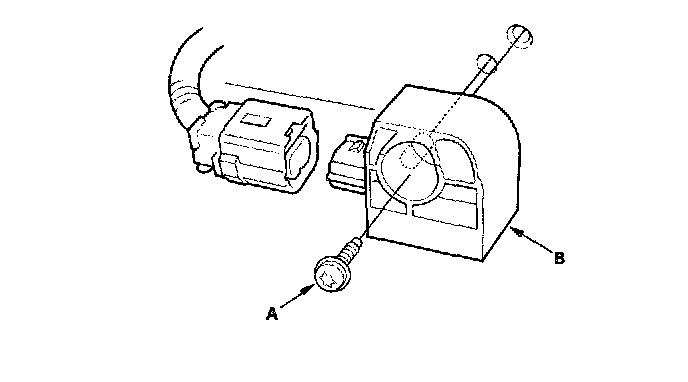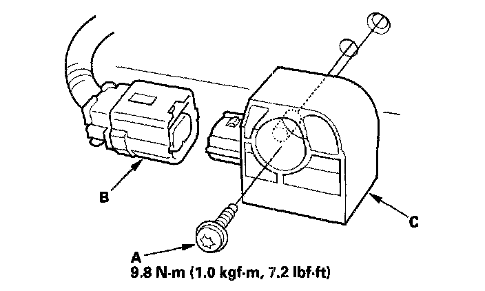 1. Install the new side impact sensor with a new Torx bolt (A) then connect the SRS side (sub) harness 2P connector (B) to the side impact sensor (C).
