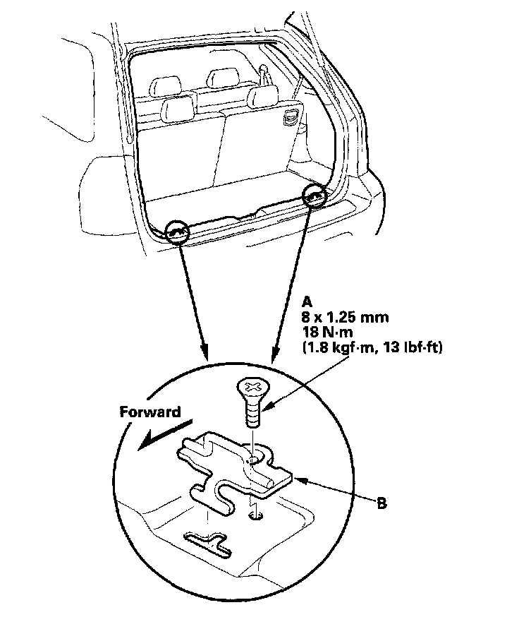 Remove the screw (A) and remove the third row child seat tether anchor (B).