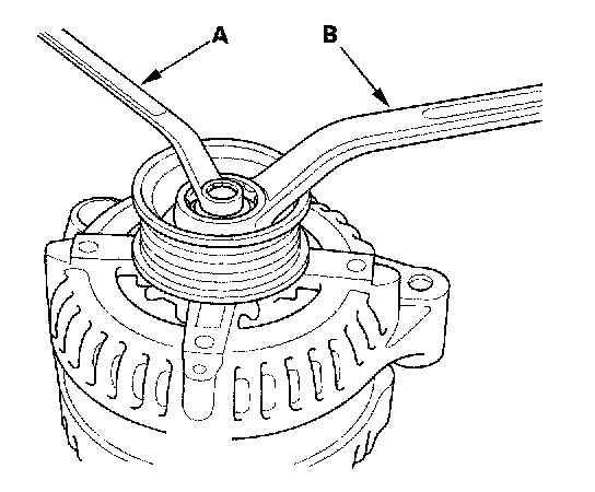 3. If the front bearing needs replacing, remove the pulley locknut with a 10 mm wrench (A) and a 22 mm wrench (B). If necessary, use an impact wrench.