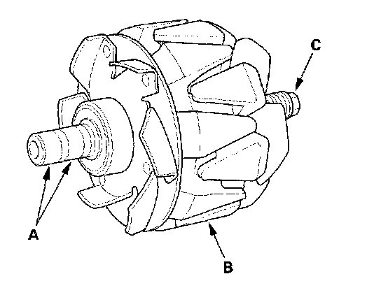 17. Then check that there is no continuity between each slip ring and the rotor (B) and the rotor shaft (C).