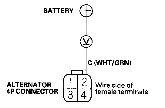 4. Measure voltage between the alternator 4P connector terminal No. 2 and the positive terminal of the battery.