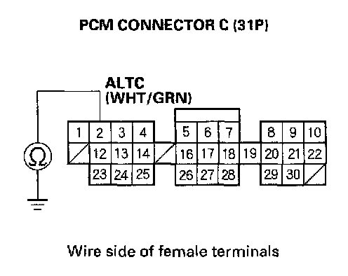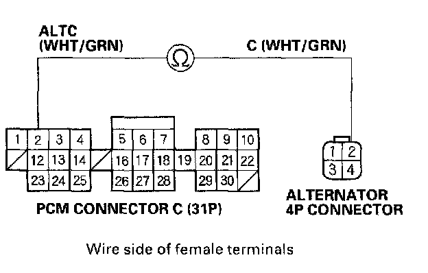 10. Check for continuity between the PCM connector terminal C2 and alternator 4P connector terminal No. 2.