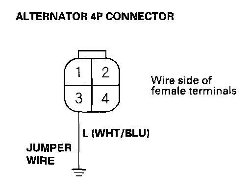 8. Connect the alternator 4P connector terminal No. 3 to body ground with a jumper wire. Turn the ignition switch ON (II).