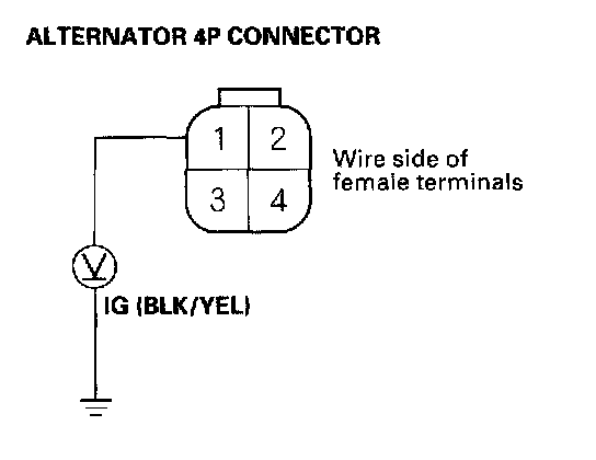 9. Measure the voltage at the No. 1 terminal of the alternator 4P connector with the ignition switch ON (II).