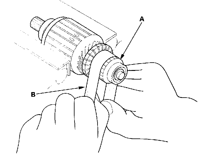 19. If the starter drive gear (B) is worn or damaged, replace the overrunning clutch assembly; the gear is not available separately.
