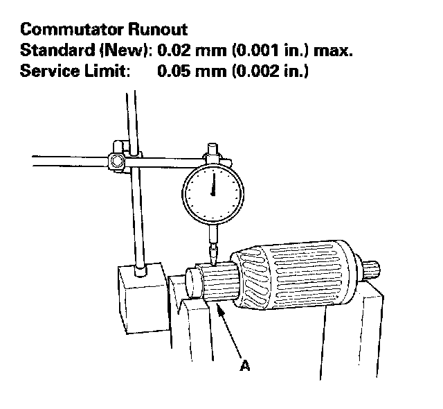 4. Check the commutator (A) surface. If the surface is dirty or burnt, resurface it with emery cloth or a lathe within the following specifications, or recondition with #500 or #600 sandpaper (B).