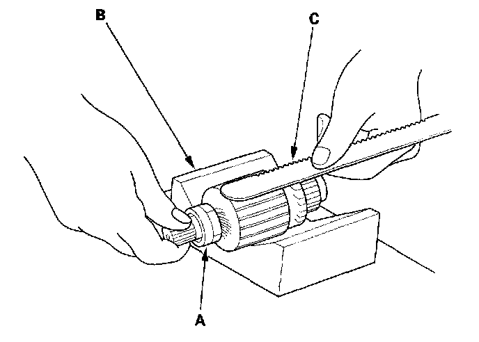 9. Place the armature (A) on an armature tester (B). Hold a hacksaw blade (C) on the armature core. If the blade is attracted to the core or vibrates while the core is turned, the armature is shorted. Replace the armature.