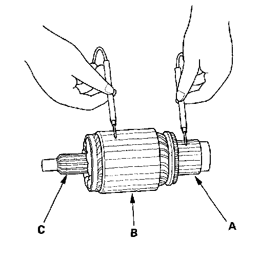 10. Check with an ohmmeter that no continuity exists between the commutator (A) and armature coil core (B), and between the commutator and armature shaft (C). If continuity exists, replace the armature.