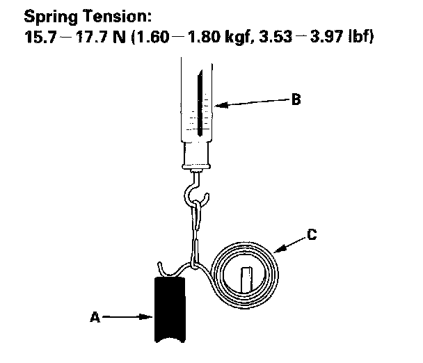 13. Insert the brush (A) into the brush holder, and bring the brush into contact with the commutator, then attach a spring scale (B) to the spring (C). Measure the spring tension at the moment the spring lifts off the brush.