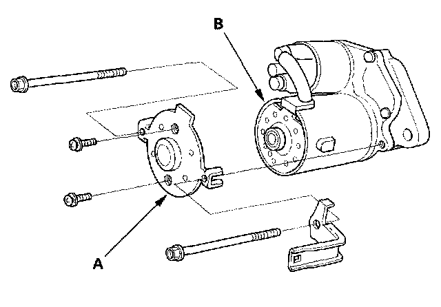 16. Install the starter end cover (A) to retain the brush holder (B).
