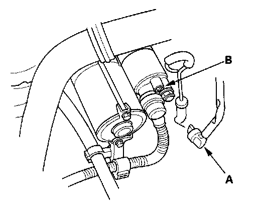 5. Make sure the transmission is in Park or Neutral, then disconnect the BLK, WHT wire (A) from the starter solenoid (B). Connect a jumper wire from the battery positive terminal to the solenoid terminal.