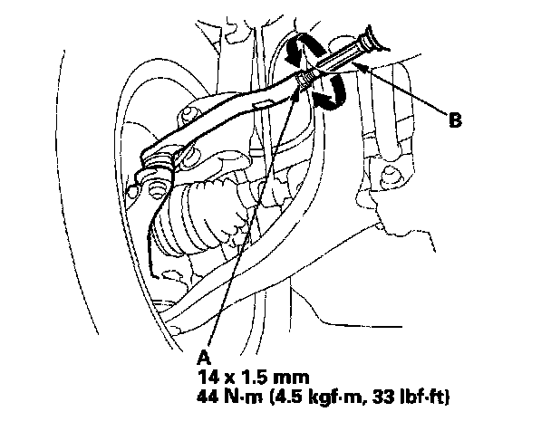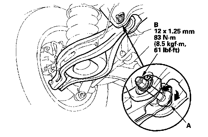 3. Hold the adjusting bolt (A) on the rear lower arm (B) and loosen the self-locking nut (B).