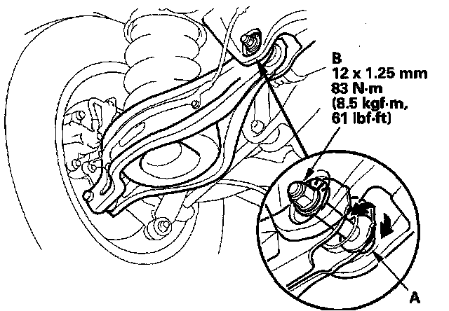 3. Hold the adjusting bolt (A) on the rear lower arm B, and loosen the self-locking nut (B).