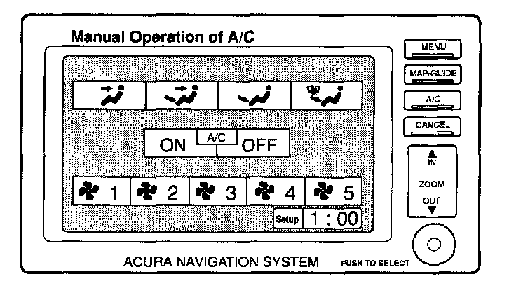 Pressing the A/C button on the navigation system control panel brings up the A/C manual operation display. Climate control settings can then be changed by touching the desired setting or by using the joystick. Refer to the vehicle Owner's Manual for specific operating instructions.