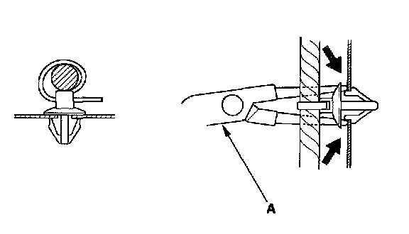 - Slip pliers (A) under the clip base and through the hole at an angle, then squeeze the expansion tabs to release the clip.