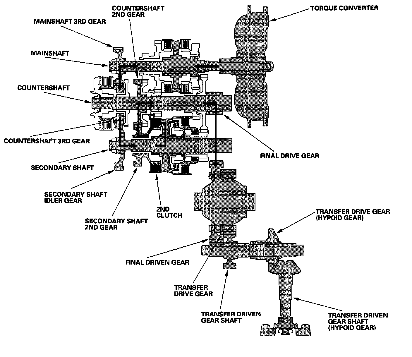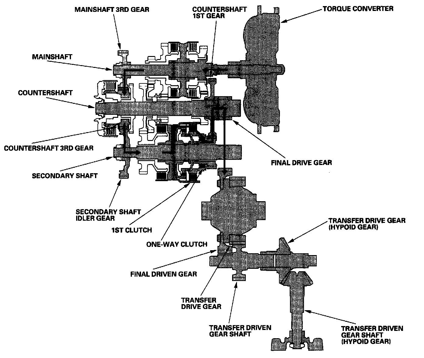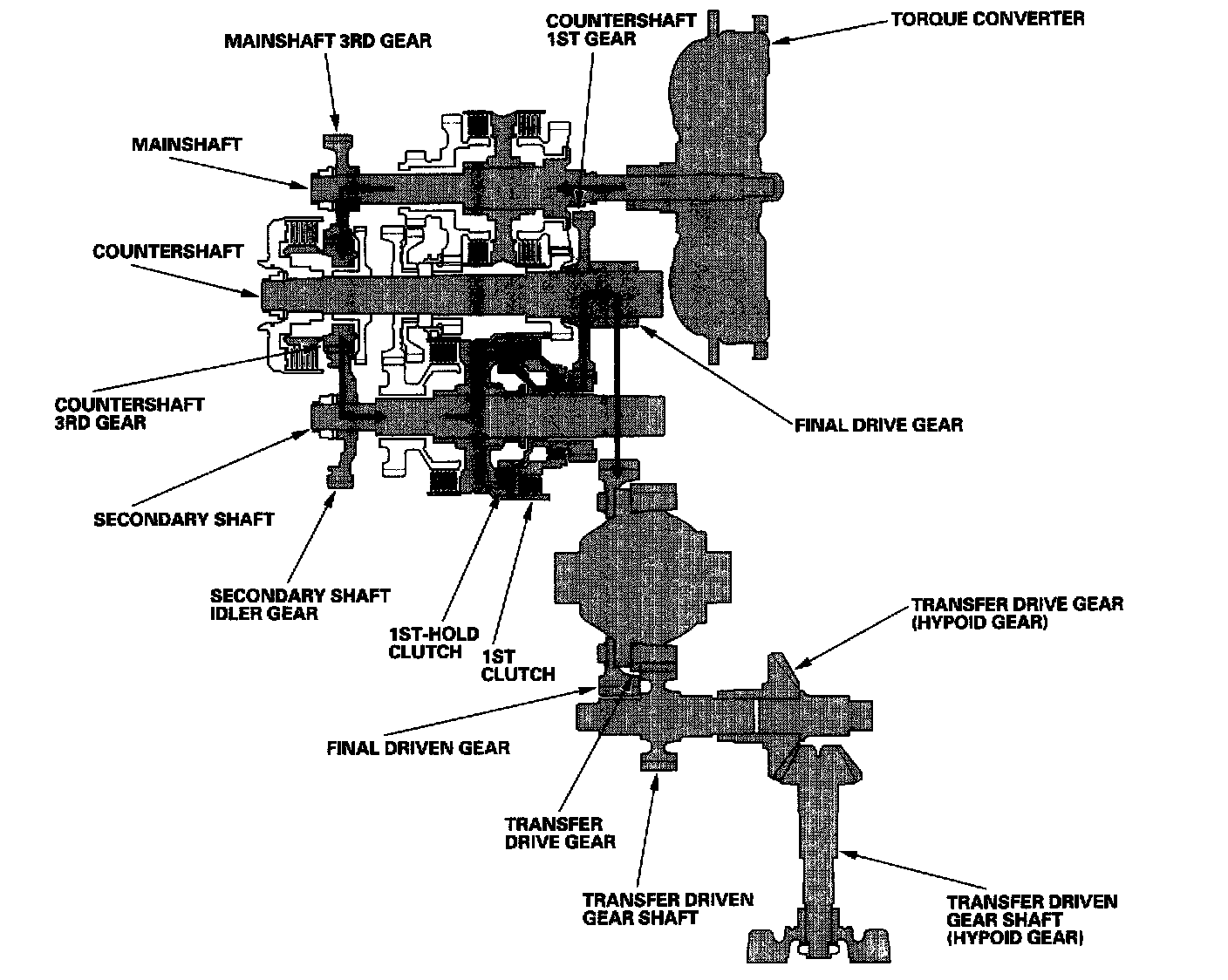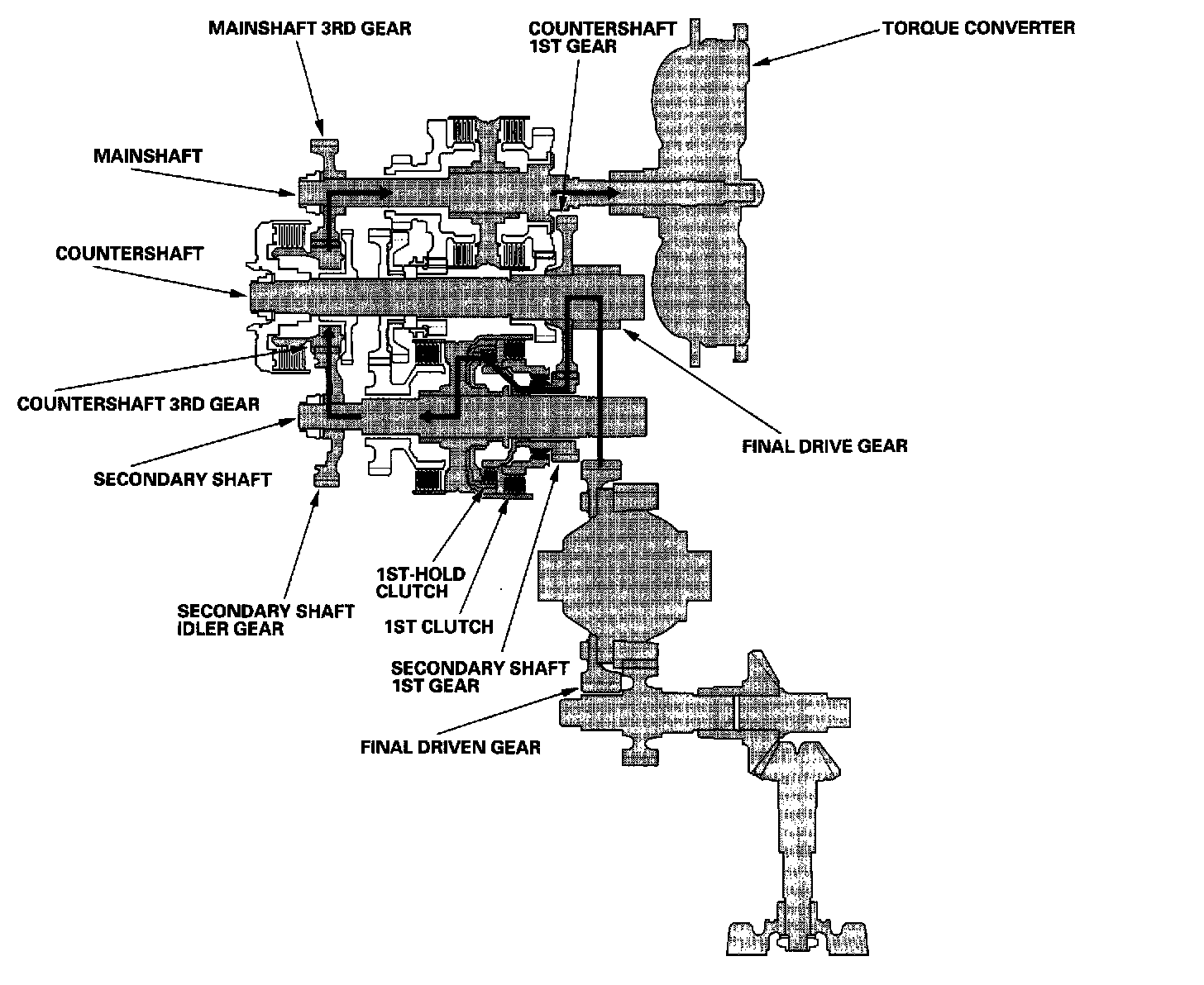- Hydraulic pressure is applied to the 1st clutch and the 1st-hold clutch. Rolling resistance from the road surface goes through the front and rear wheels to the final drive gear, then to the secondary shaft idler gear.