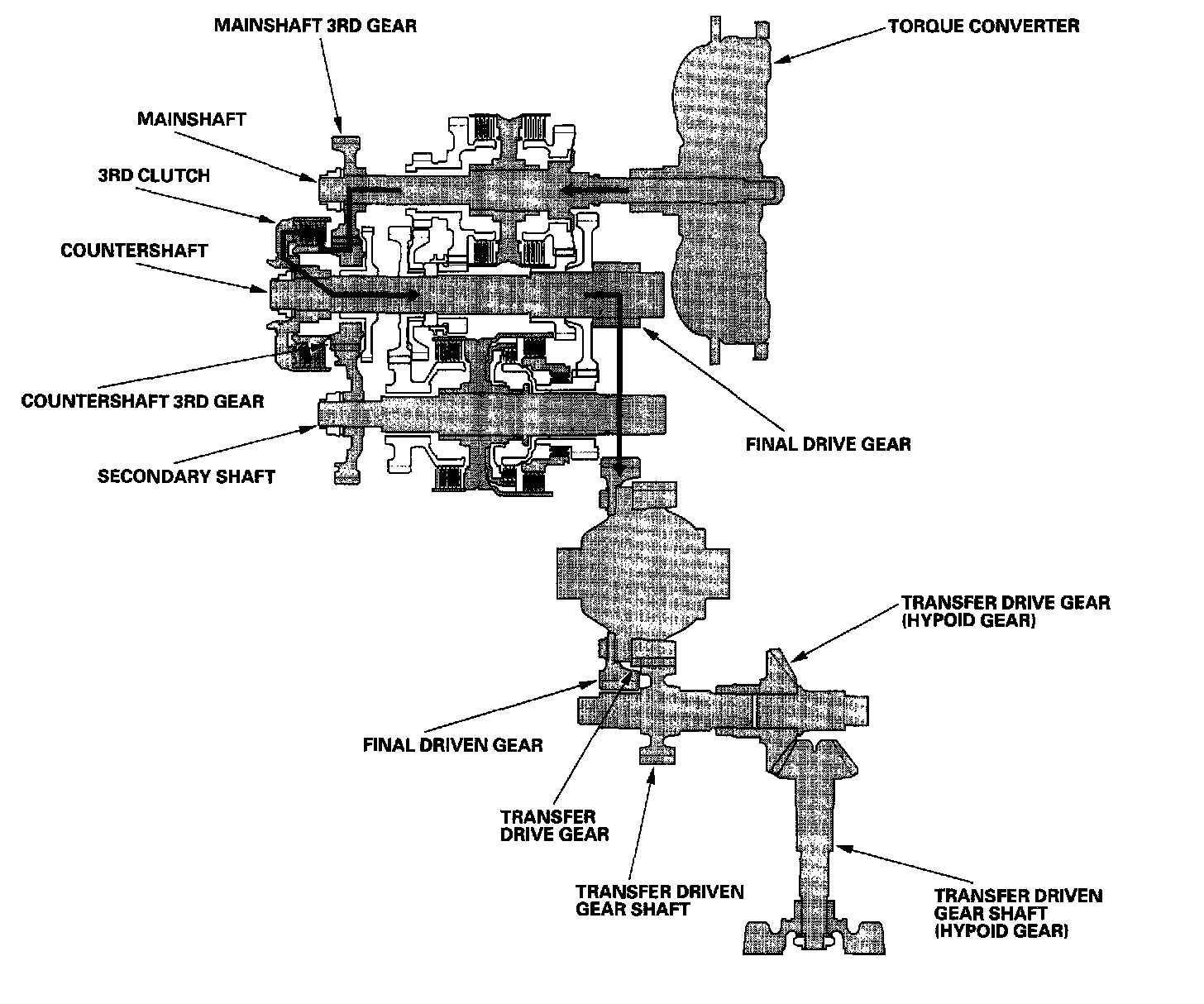 - Hydraulic pressure is applied to the 3rd clutch, then the 3rd clutch engages the countershaft 3rd gear with the countershaft.