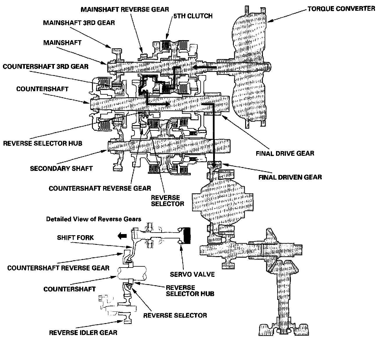 - Hydraulic pressure is applied to the servo valve to engage the reverse selector with the countershaft (reverse gear while the shift lever is in the [R] position). Hydraulic pressure is also applied to the 5th clutch, then the 5th clutch engages the mainshaft reverse gear with the mainshaft.