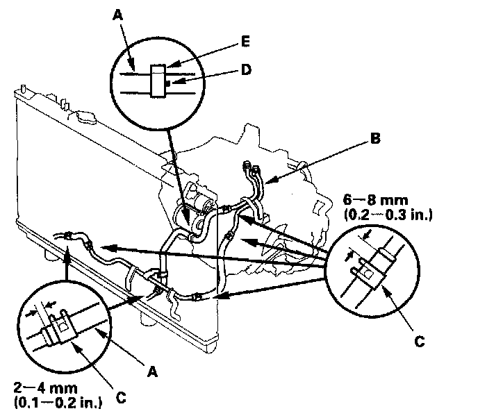 Connect the cooler hoses (A) to the lines (B) and the ATF cooler, and secure them with the clips (C).