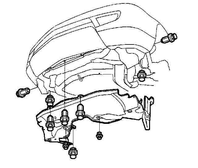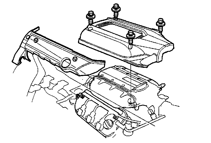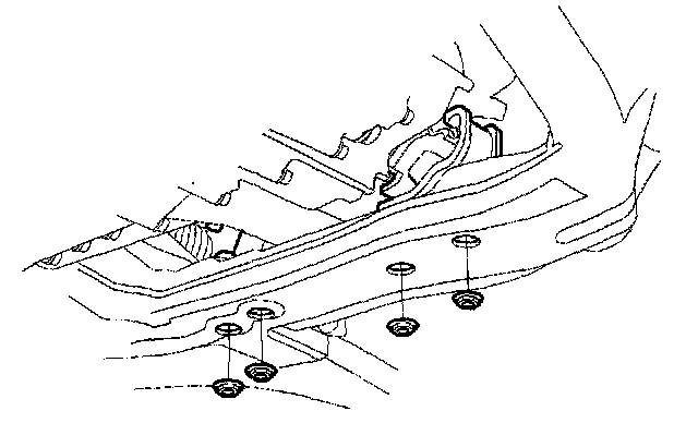 9. Remove the harness clamps, connectors, and fuse box from the battery base. Remove the bolt securing the battery base from under the vehicle, and the remaining bolts (3) from the engine compartment, then remove the battery base.
